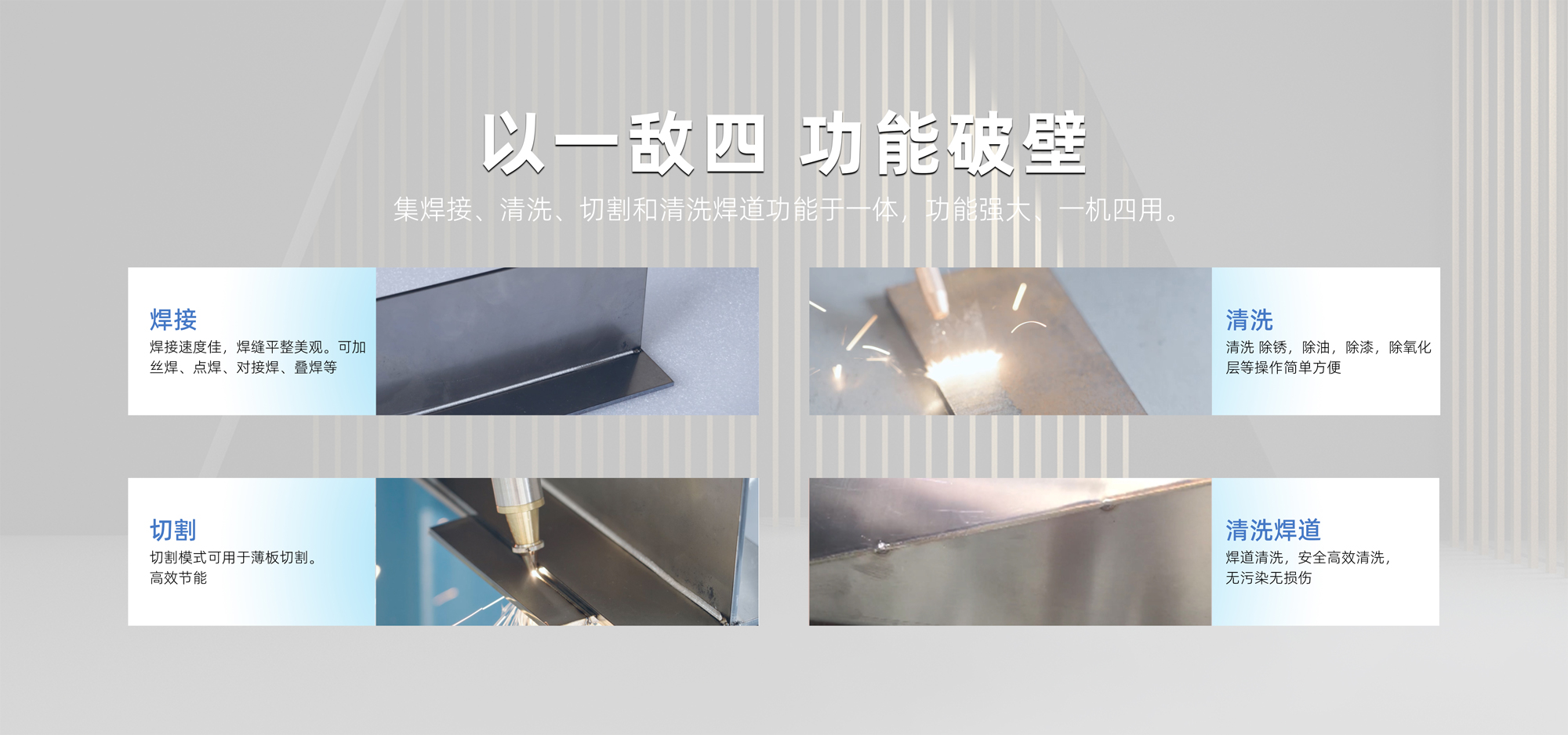集焊接、清洗、切割和清洗焊道功能于一體,功能強(qiáng)大、一機(jī)四用。